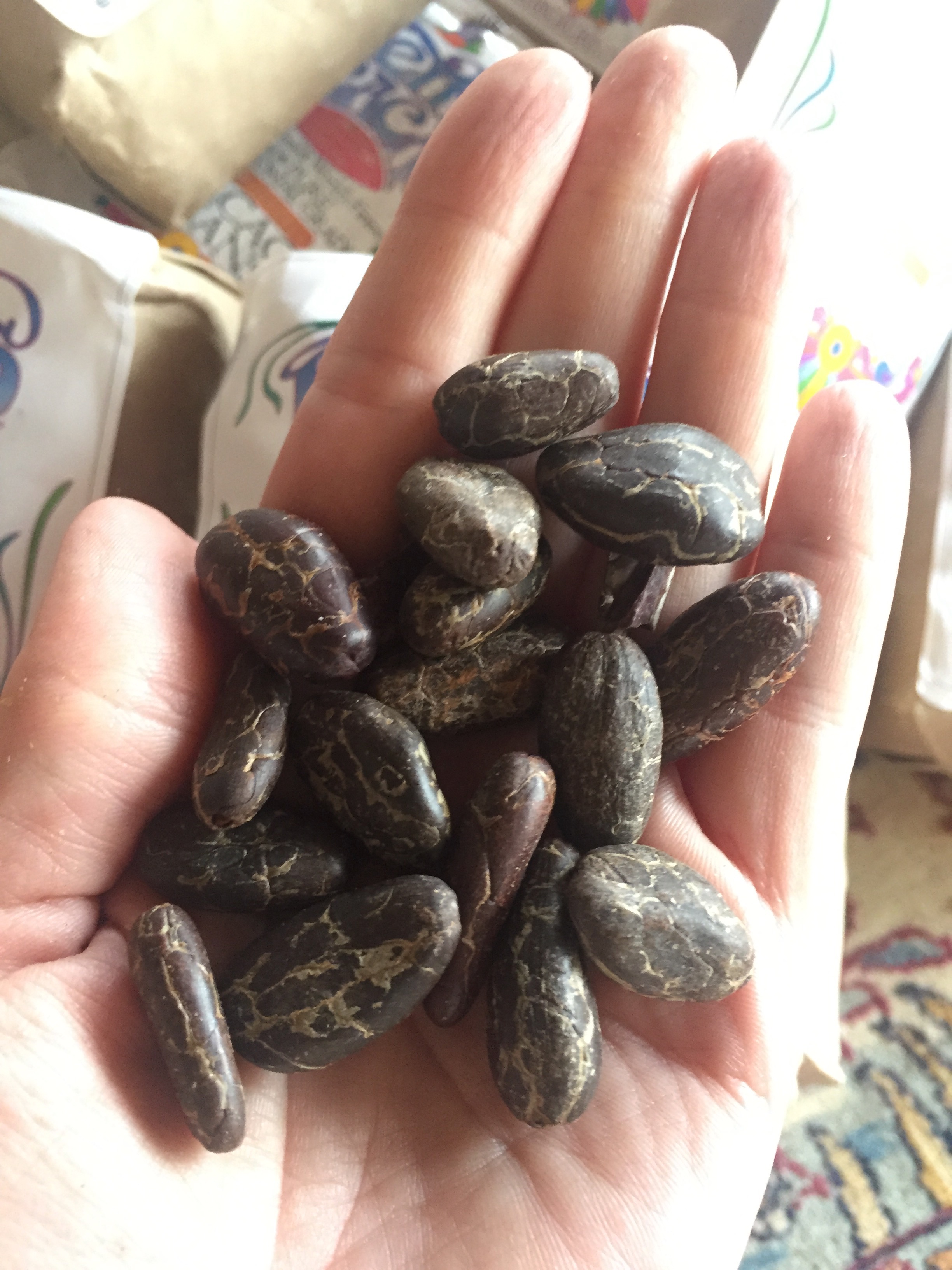 In our workshop, a team of local indigenous workers hand inspect every bean a second time to remove any remaining low-quality beans or other contaminants. Some of the nicest looking, mostly whole, beans are packaged to be sold as our “Hand Peeled Cacao Beans”. But most of our beans are milled to create the smooth, magical cacao paste that we use in our ceremonies and drink every day.